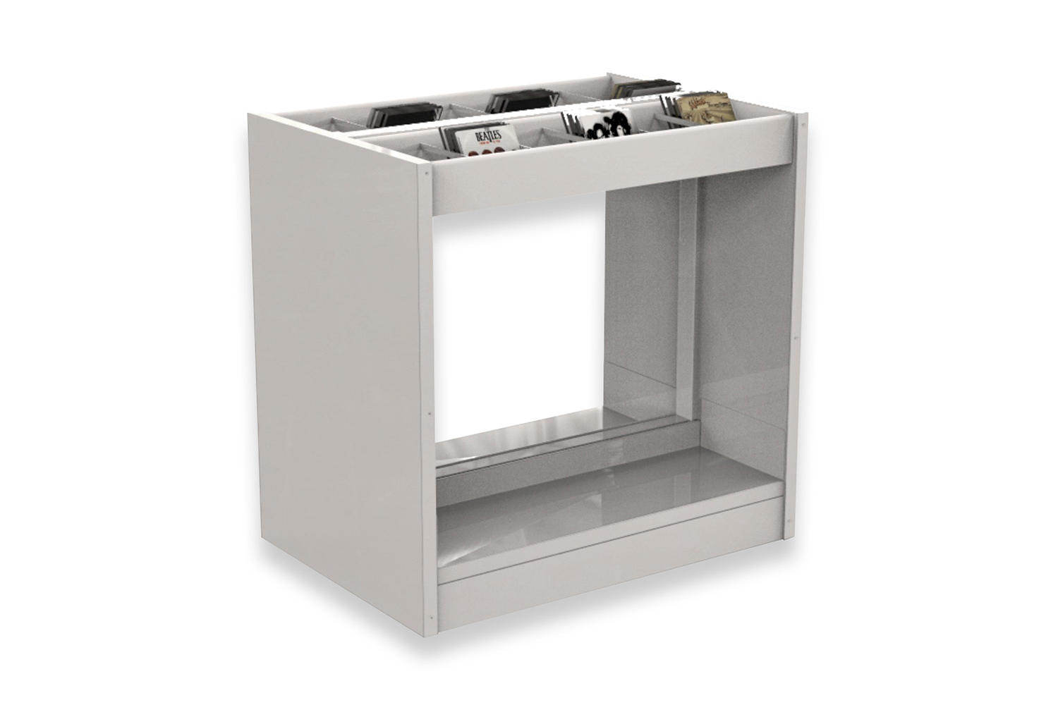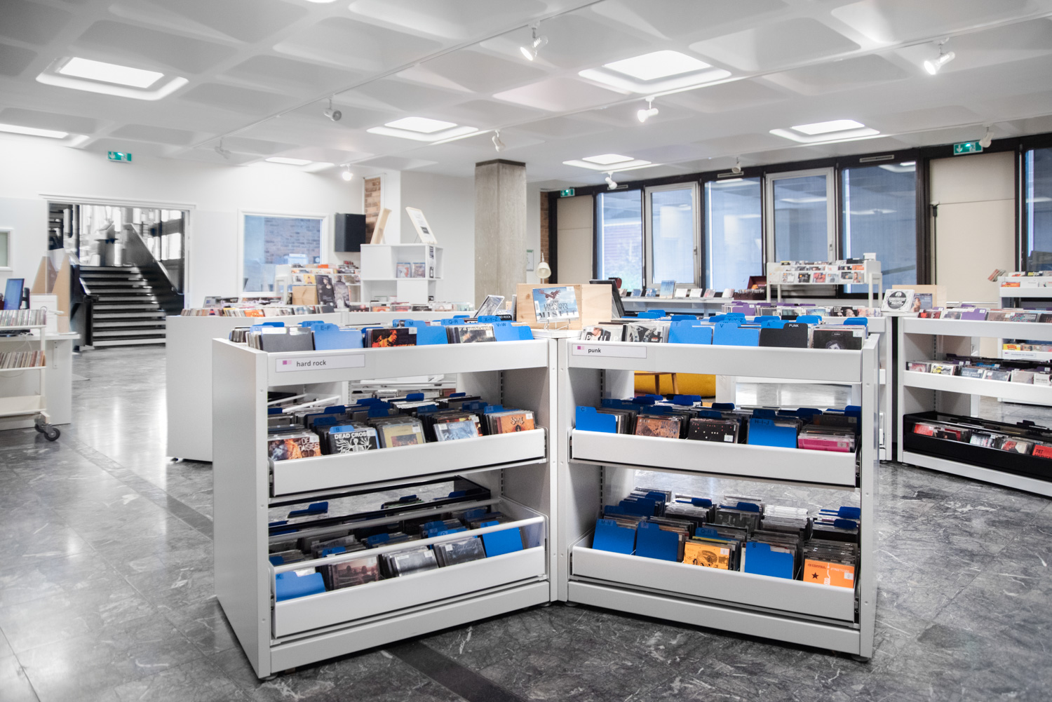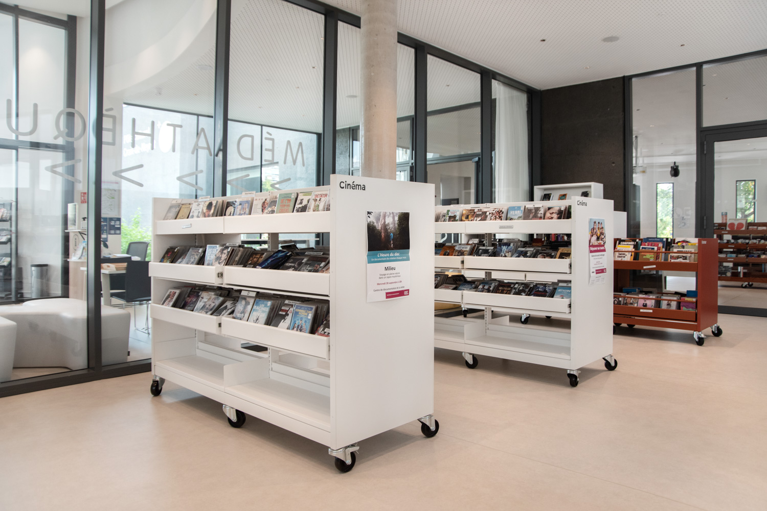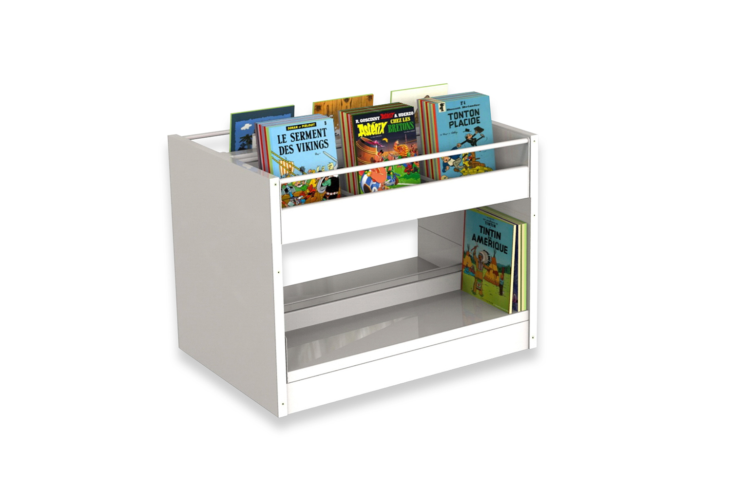 Hyllorna finns i flera höjder med synliga eller dolda hjul för att vara lätt flyttbara. De individuella exponeringslådorna är antingen fast monterade eller utdragbara samt har räfflad gummimatta som hjälper till att hålla böckerna uppe så de inte glider ned. Det ingår avdelare till exponeringslådorna.