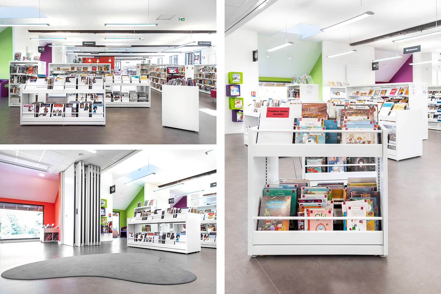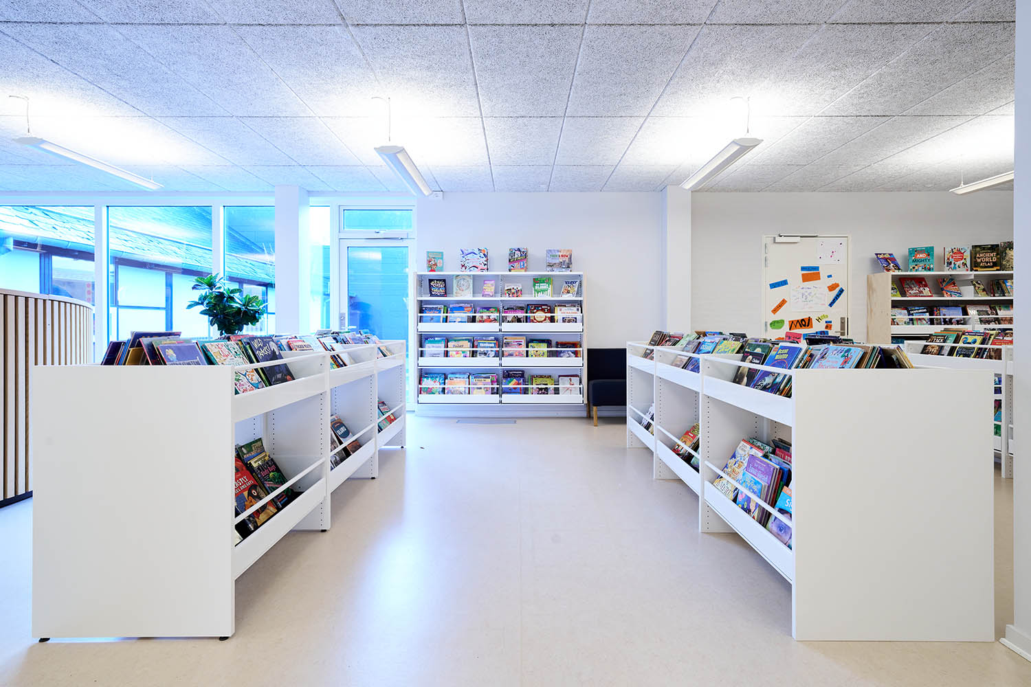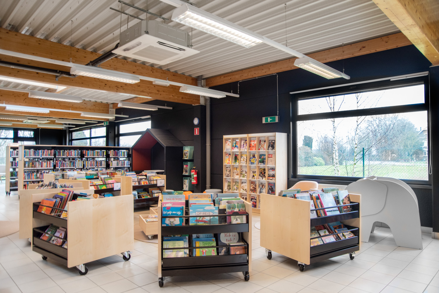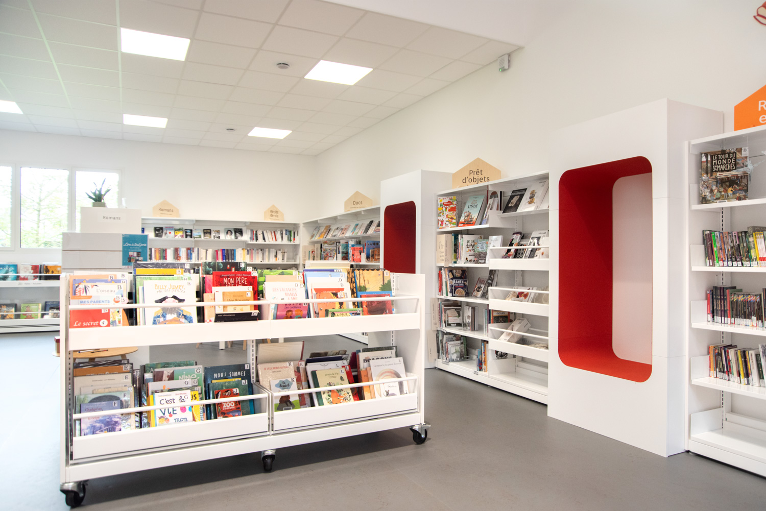 Hyllorna finns i flera höjder med synliga eller dolda hjul för att vara lätt flyttbara. De individuella exponeringslådorna är antingen fast monterade eller utdragbara samt har räfflad gummimatta som hjälper till att hålla böckerna uppe så de inte glider ned. Det ingår avdelare till exponeringslådorna.