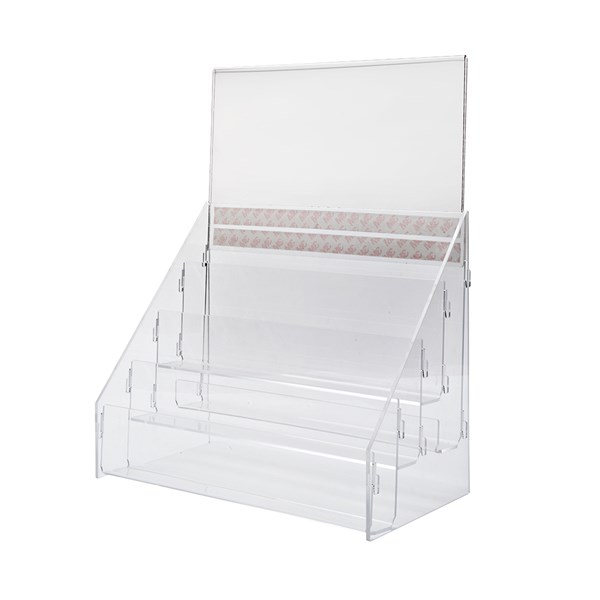 Allsidigt broschyrställ med 4 fack i våningar. Mycket lämpligt för exponering och förvaring av broschyrer och blanketter.