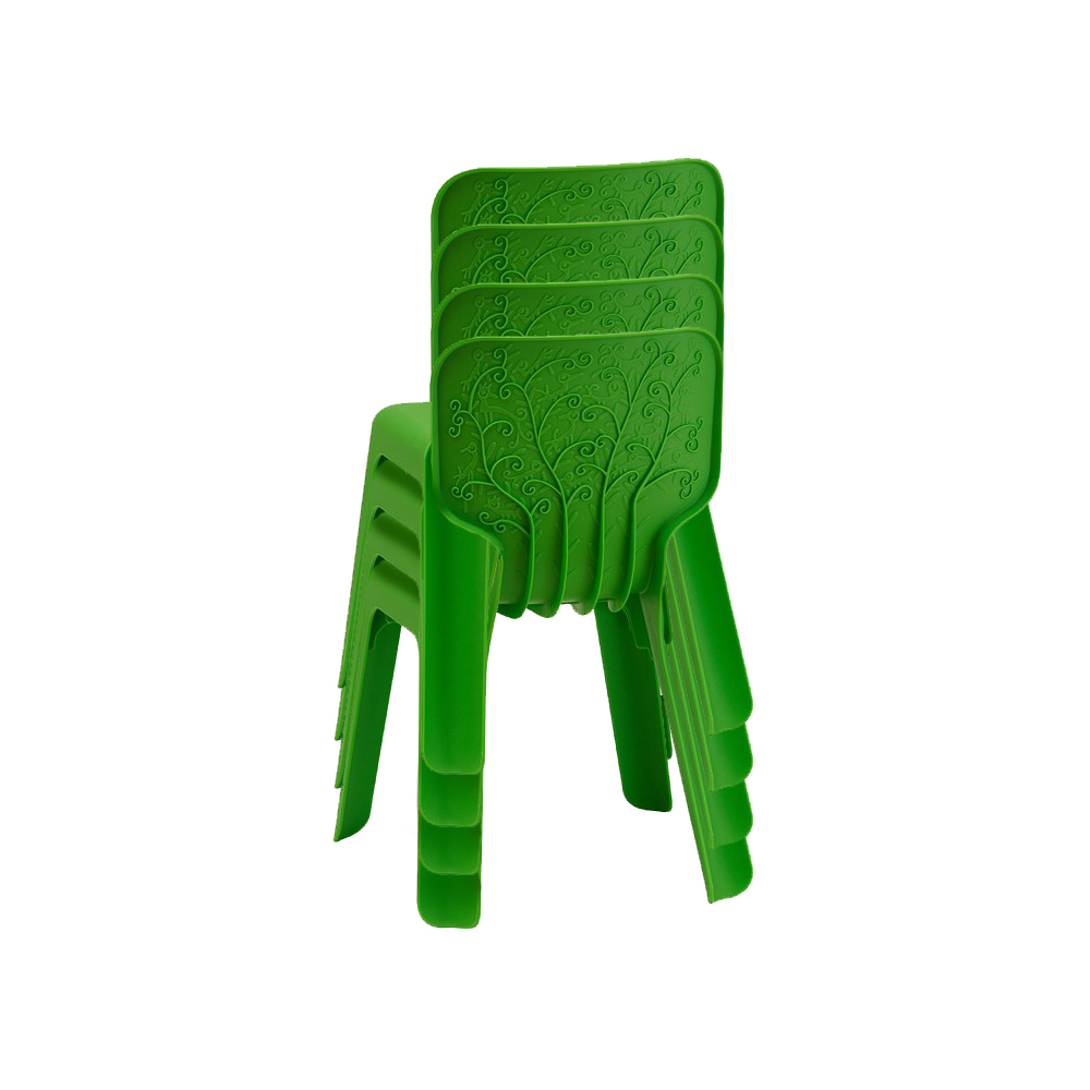 En lätt, stapelbar stol vars själ finns i sittskalets utformning. Den lövverksornamenterade ryggen med små fåglar här och där ger stolen stabilitet och utgör samtidigt ett kreativt, lustfyllt inslag. Här förenas idé med funktion.