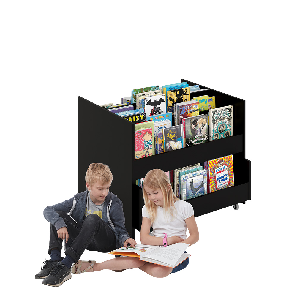 Pouplärt bilderbokstråg i 3 våningar med 2 flyttbara avdelare och utdragbara lådor med 2 fack på hjul på båda sidor.