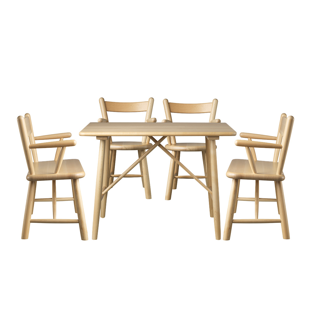 Möblerna är tillverkade av lackerad bok och kräver minimalt underhåll. De rengörs enkelt genom att torkas av med en fuktig trasa.