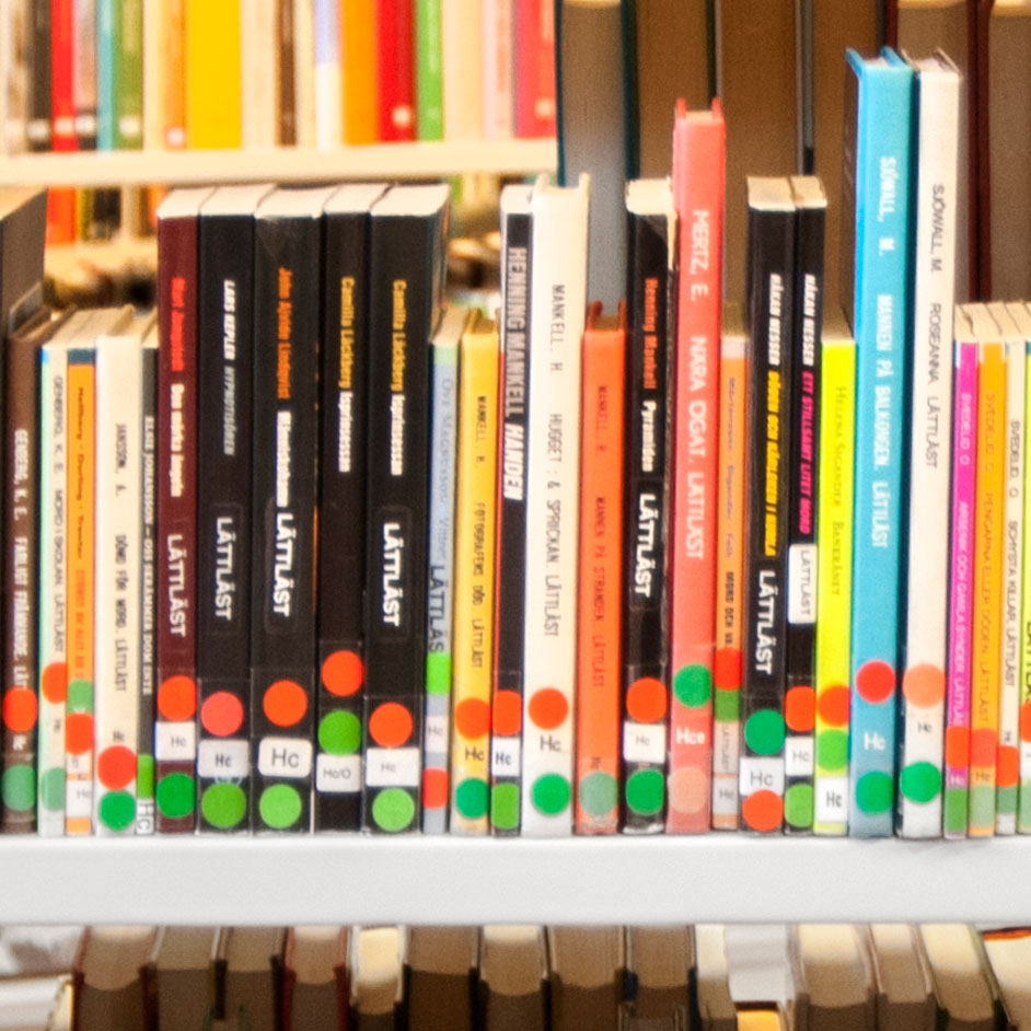 Permanenta självhäftande, utstansade färgmarkeringar i ark för att märka bokryggar, CD/DVD-emballage m.m.