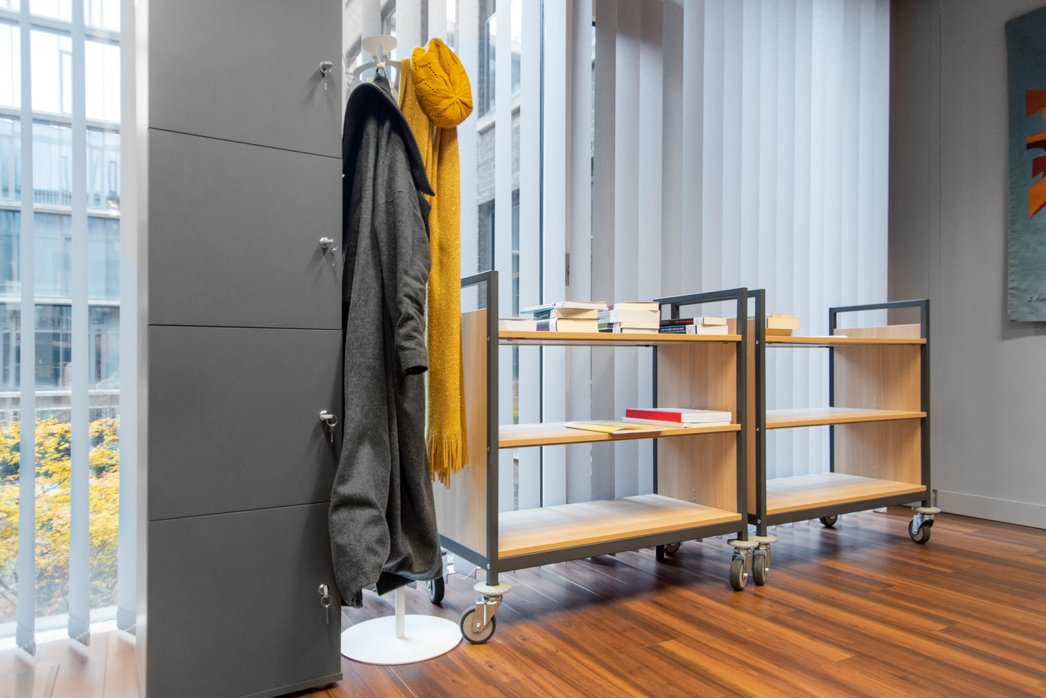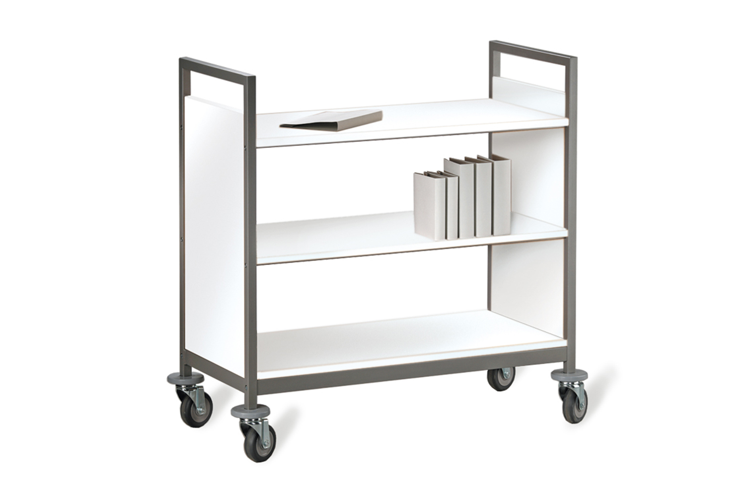 Classic Line bokvagn den finns i sju modeller och med skyddande gummiringar över hjulen som förebygger skador på väggar och dörrar i byggnaden.
