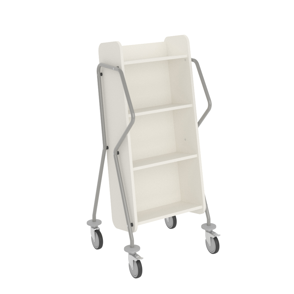 Ergonomisk, användarvänlig, enkelsidig bokvagn med 4 hyllplan med generösa hyllavstånd. Idealisk även för böcker i det lite större formatet.