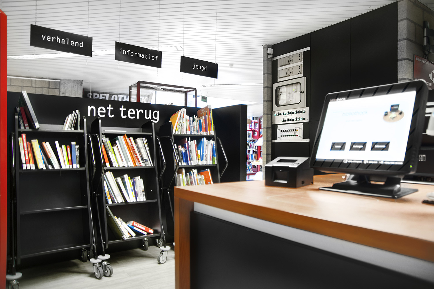 Ergonomisk, användarvänlig, enkelsidig bokvagn med 4 hyllplan med generösa hyllavstånd. Idealisk även för böcker i det lite större formatet.