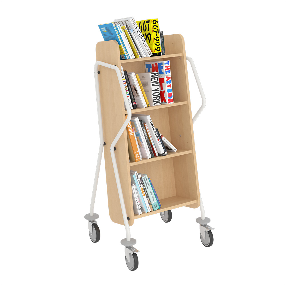 Ergonomisk, användarvänlig, enkelsidig bokvagn med 4 hyllplan med generösa hyllavstånd. Idealisk även för böcker i det lite större formatet.