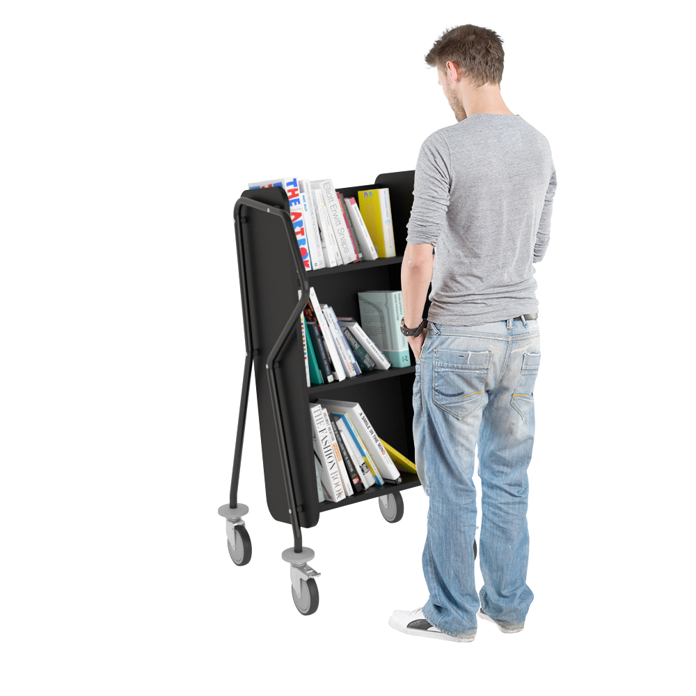 Ergonomisk, användarvänlig, enkelsidig bokvagn med 3 hyllplan med generösa hyllavstånd. Idealisk även för böcker i lite större format.