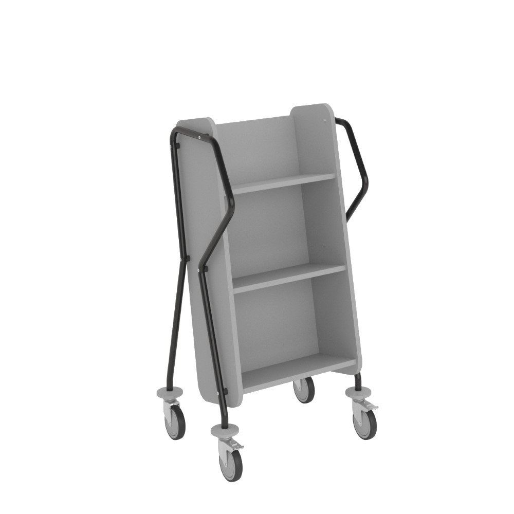 Ergonomisk, användarvänlig, enkelsidig bokvagn med 3 hyllplan med generösa hyllavstånd. Idealisk även för böcker i lite större format.