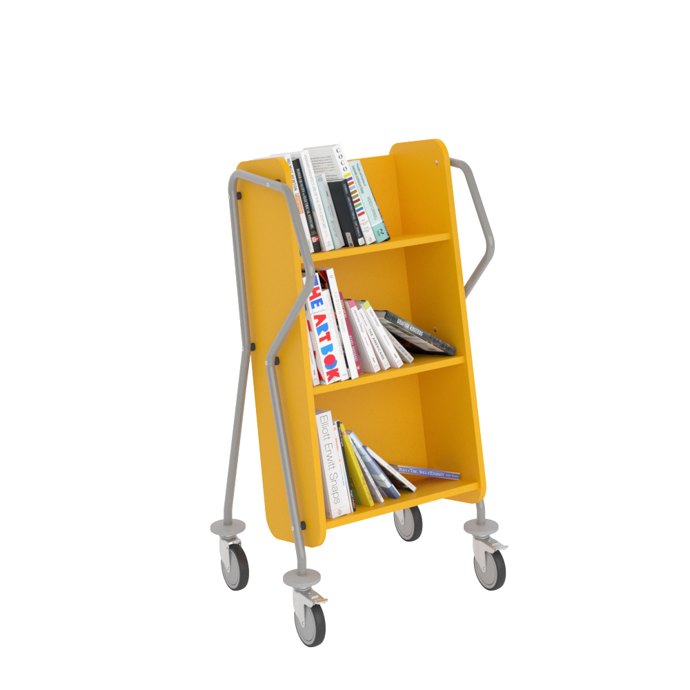 Ergonomisk, användarvänlig, enkelsidig bokvagn med 3 hyllplan med generösa hyllavstånd. Idealisk även för böcker i lite större format.