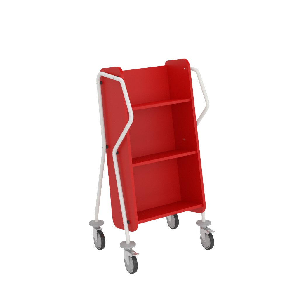 Ergonomisk, användarvänlig, enkelsidig bokvagn med 3 hyllplan med generösa hyllavstånd. Idealisk även för böcker i lite större format.