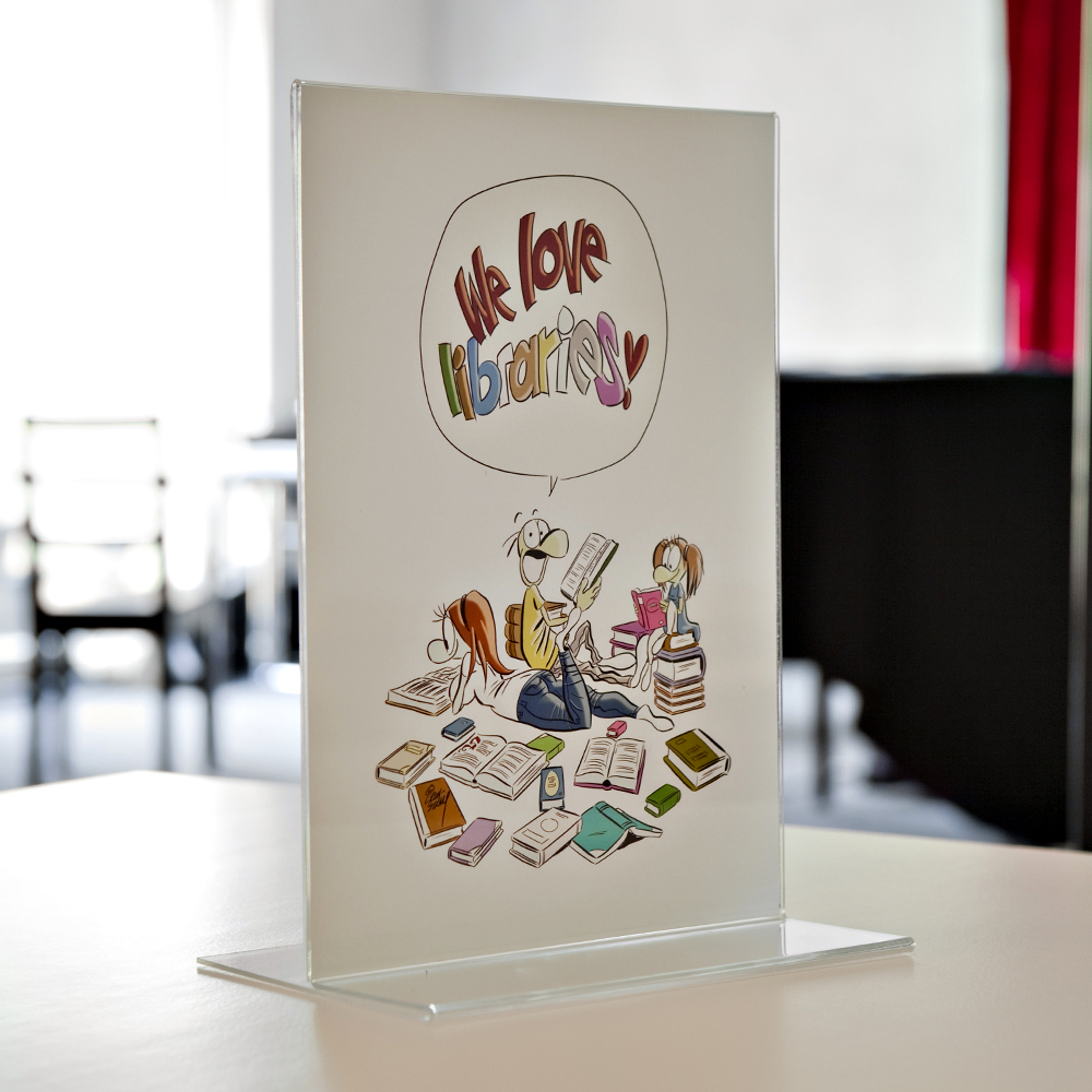 Praktiskt dubbelsidiga ställ för skyltning och information för bord, diskar, hyllor skyltfönster osv..