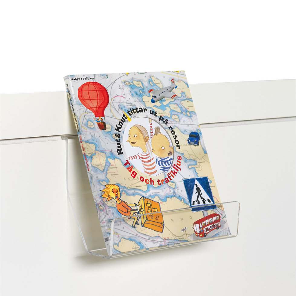 Allsidiga hållare för flexibel frontexponering av böcker, AV-media som CD/DVD, tidskrifter, broschyrer.