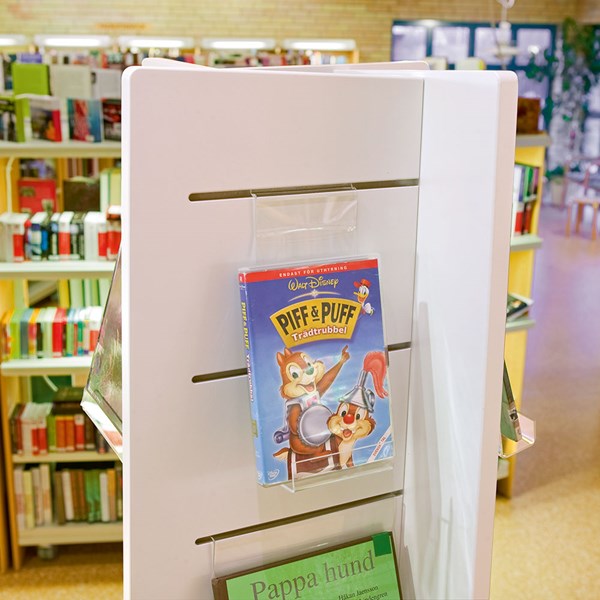 Allsidiga hållare för flexibel frontexponering av böcker, AV-media som CD/DVD, tidskrifter, broschyrer.