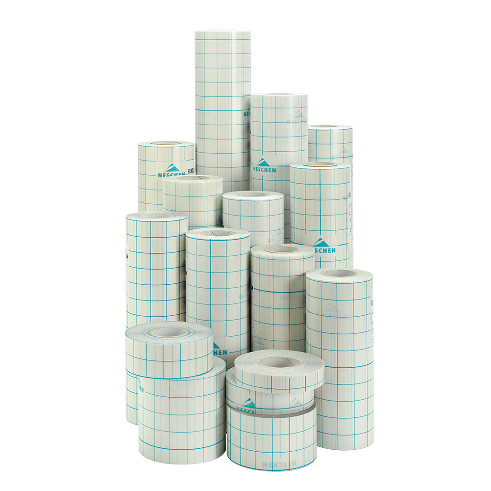Självhäftande, transparent, blank plastfilm; mjuk. Fäster omgående; ej korrigerbar.