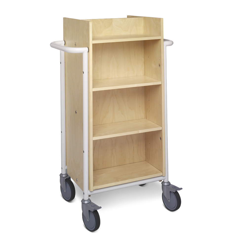 Funktionell, dubbelsidig vagn med 8 hyllplan. 6 hyllplan är flyttbara för att passa olika bokstorlekar.