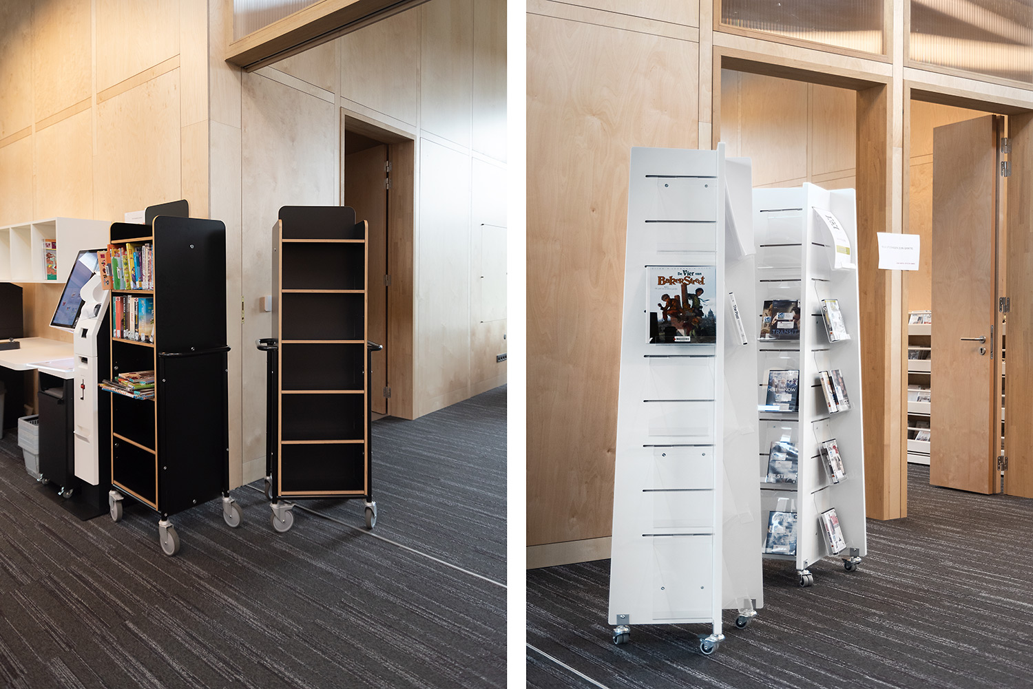 Denna bokvagn kan användas som ett hyllsystem som kan flyttas runt i biblioteket efter var den behövs.