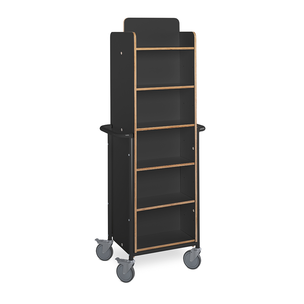Stor, dubbelsidig vagn med 12 hyllplann. 10 hyllplanen är flyttbara för att passa olika bokstorlekar.