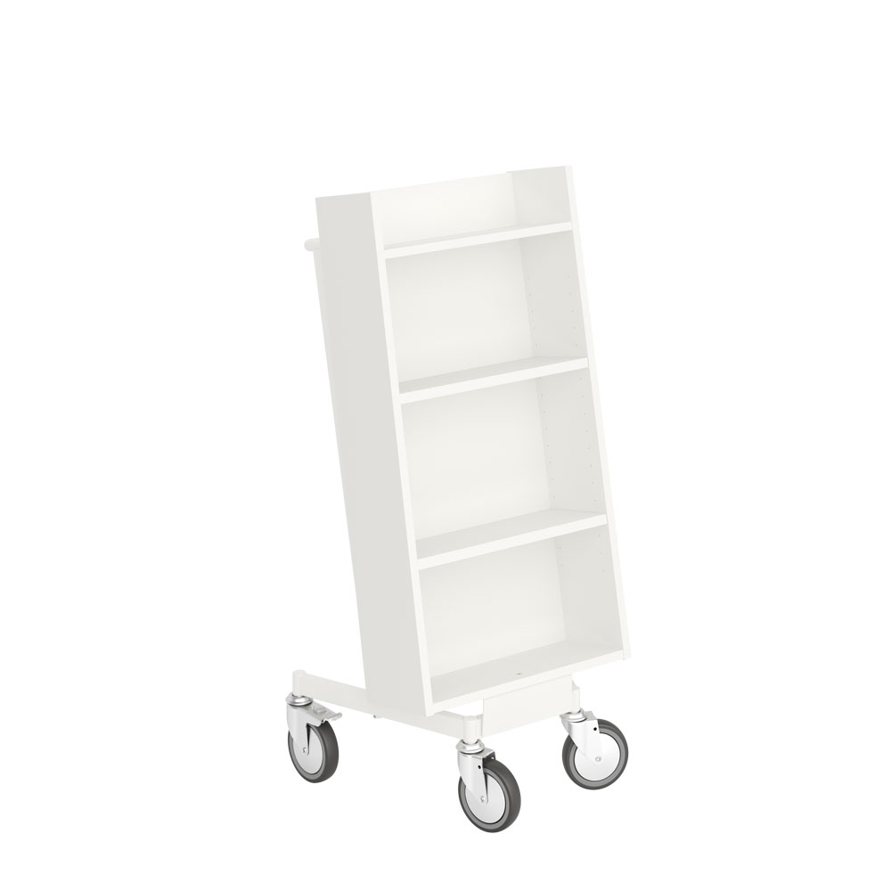 Smidig, enkelsidig vagn med 4 hyllplan. De två mellersta hyllplanen är flyttbara för att passa olika bokstorlekar.