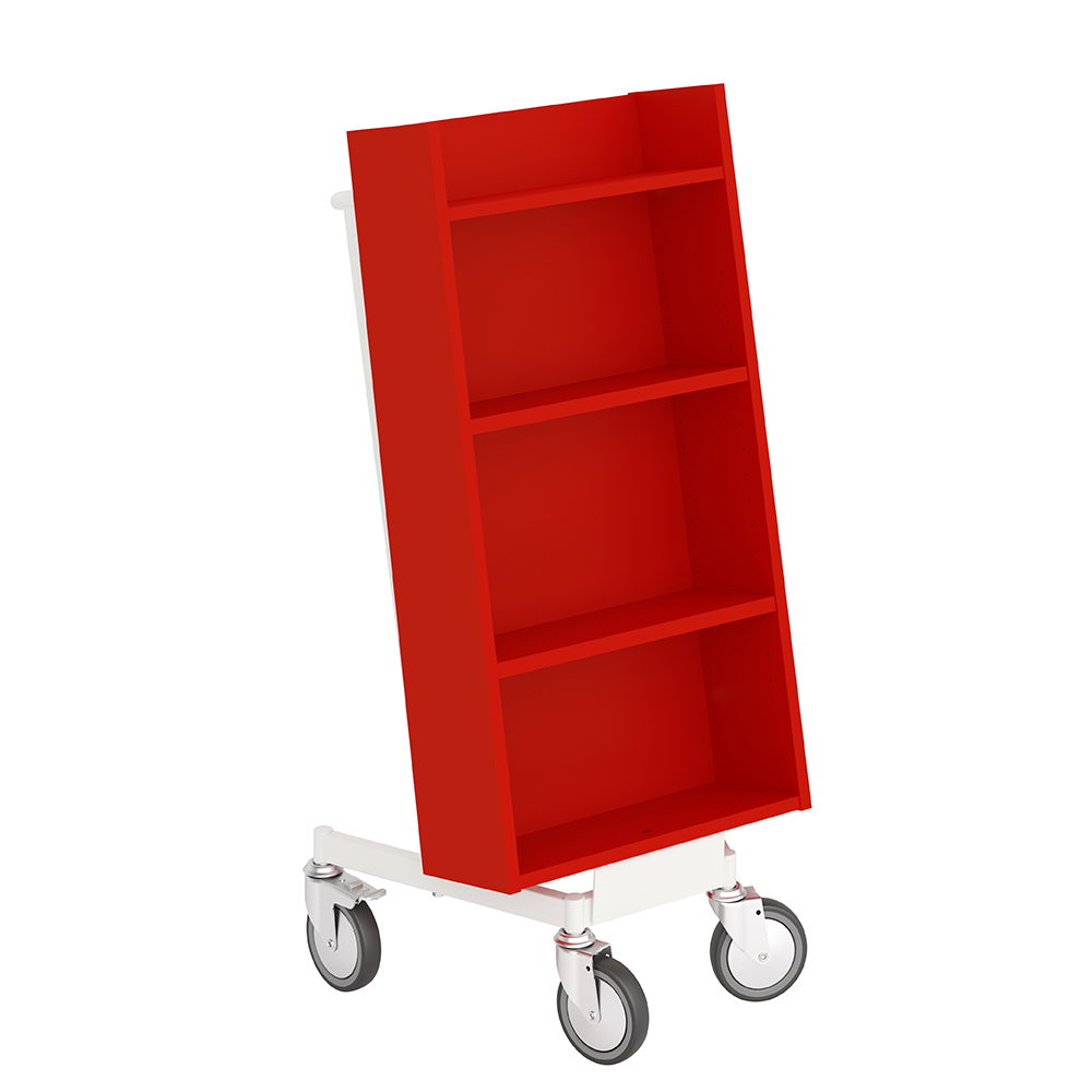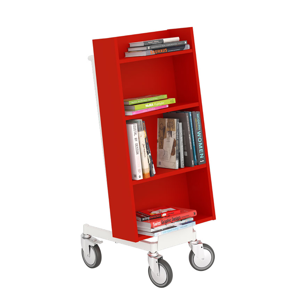 Smidig, enkelsidig vagn med 4 hyllplan. De två mellersta hyllplanen är flyttbara för att passa olika bokstorlekar.