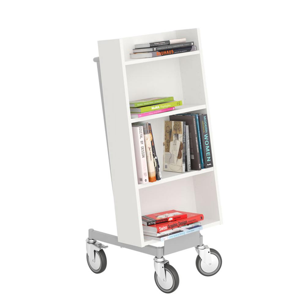 Smidig, enkelsidig vagn med 4 hyllplan. De två mellersta hyllplanen är flyttbara för att passa olika bokstorlekar.