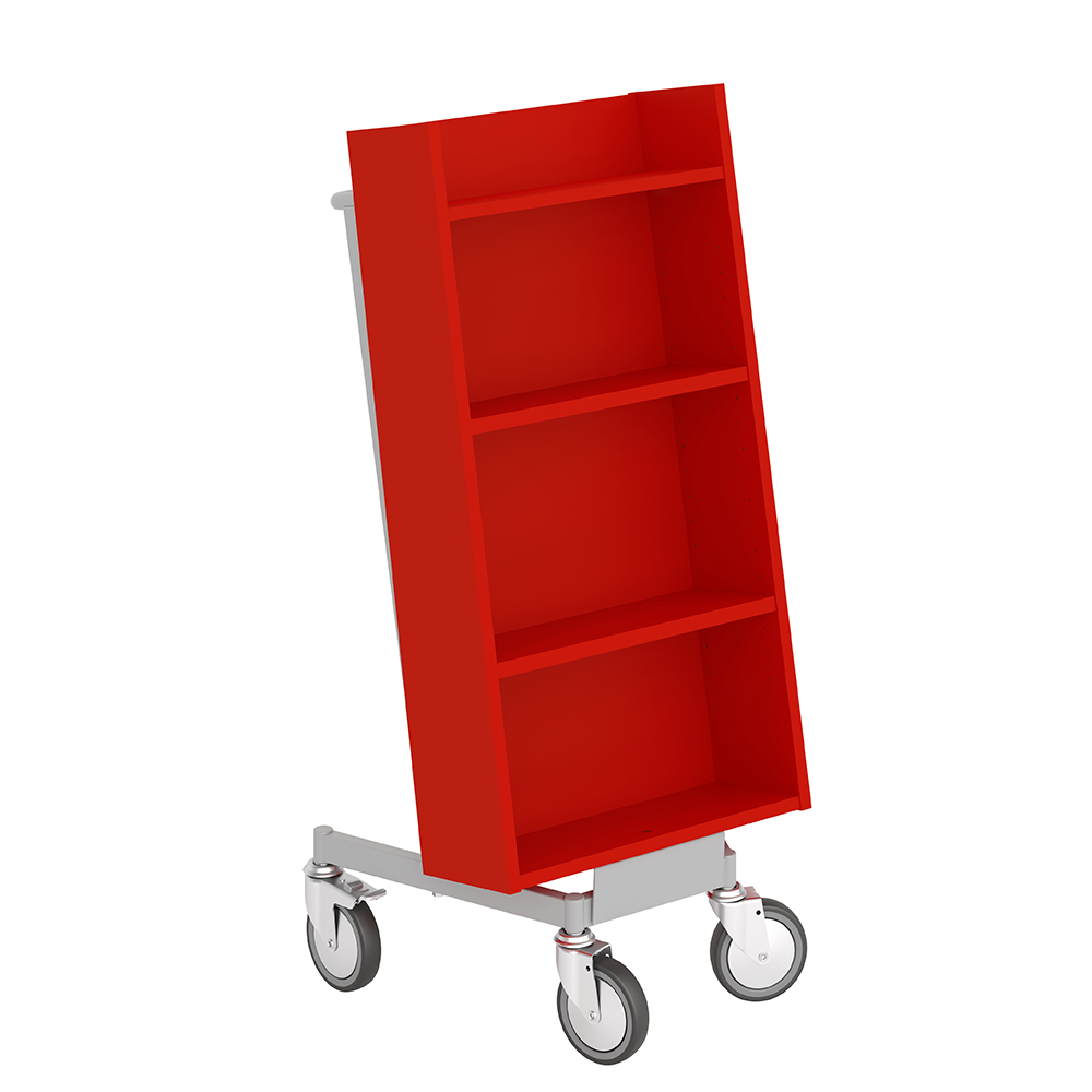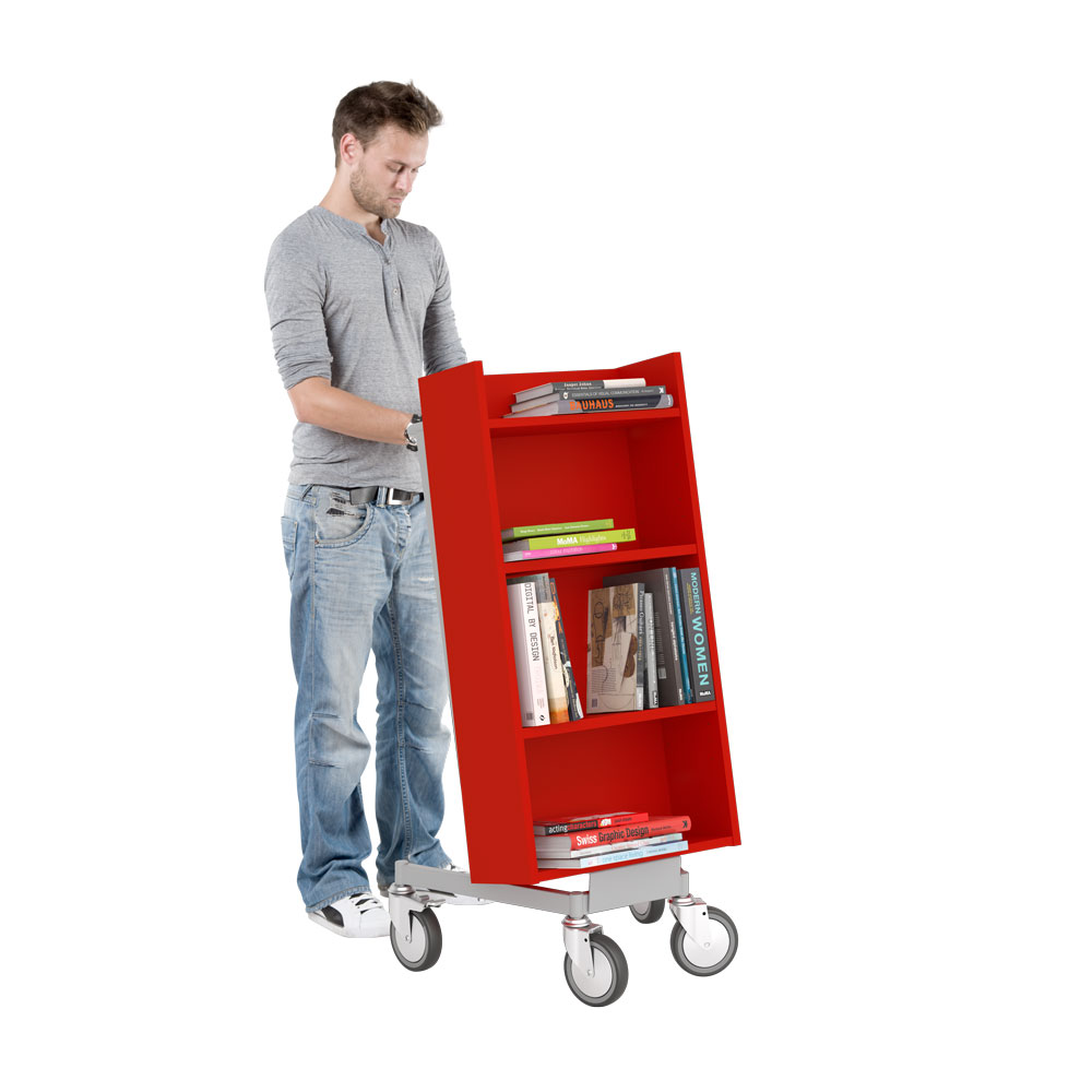 Smidig, enkelsidig vagn med 4 hyllplan. De två mellersta hyllplanen är flyttbara för att passa olika bokstorlekar.