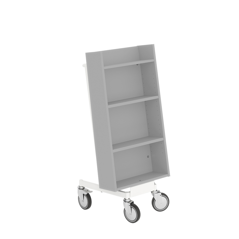 Smidig, enkelsidig vagn med 4 hyllplan. De två mellersta hyllplanen är flyttbara för att passa olika bokstorlekar.