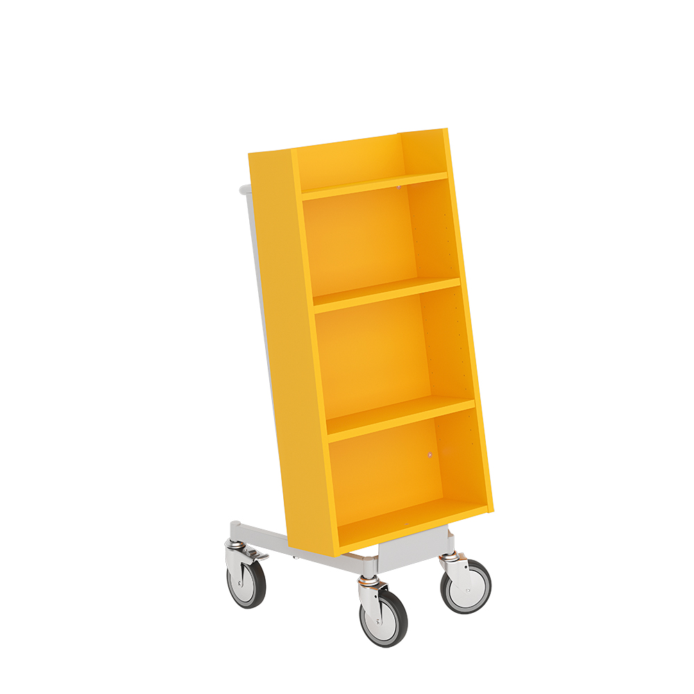 Smidig, enkelsidig vagn med 4 hyllplan. De två mellersta hyllplanen är flyttbara för att passa olika bokstorlekar.