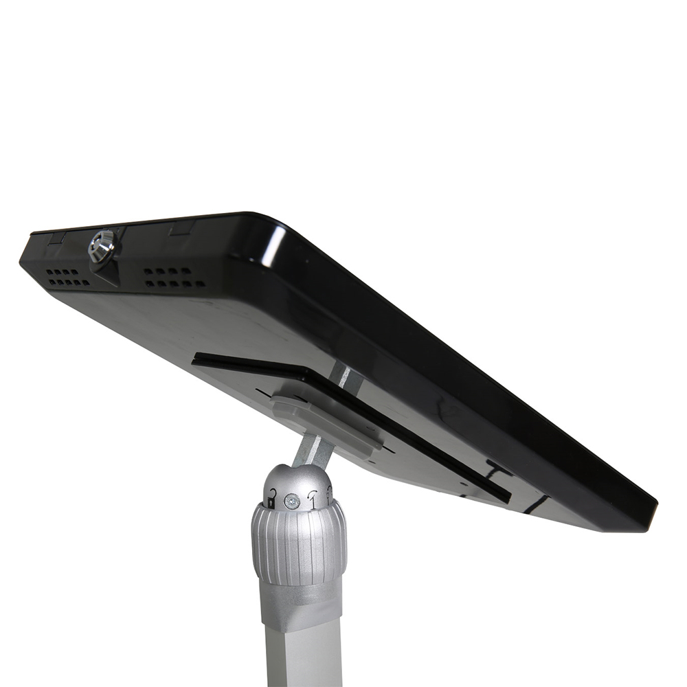 Hållaren kan justeras till önskad vinkel för bästa läsbarhet och kan ställas in till både horisontellt och vertikalt läsläge. Hållaren är dessutom höjdjusterbar för att kunna anpassas till både sittande och stående informationssökande. Den passar till nästintill alla modeller av surfplattor.