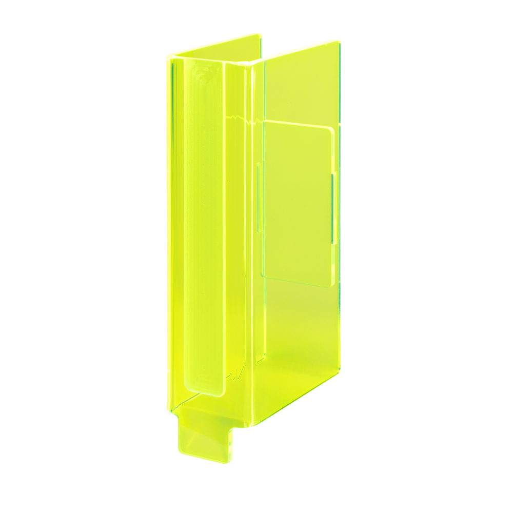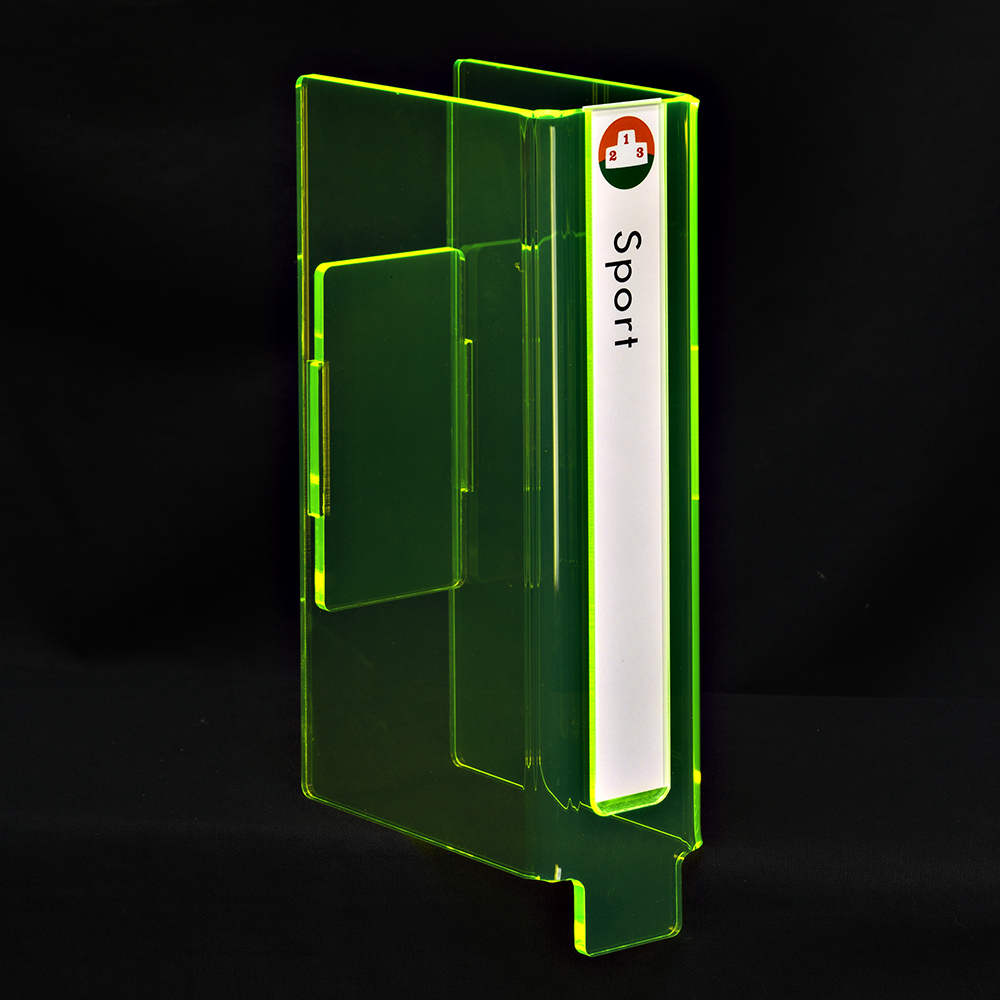 Hyllmarkeringar i glass look eller med fluorescerande effekt. Hög detaljfinish.