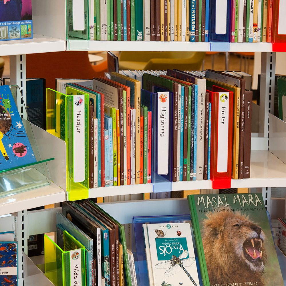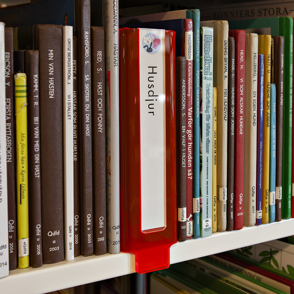 Hyllmarkeringar i glass look eller med fluorescerande effekt. Hög detaljfinish.