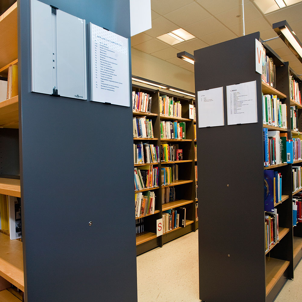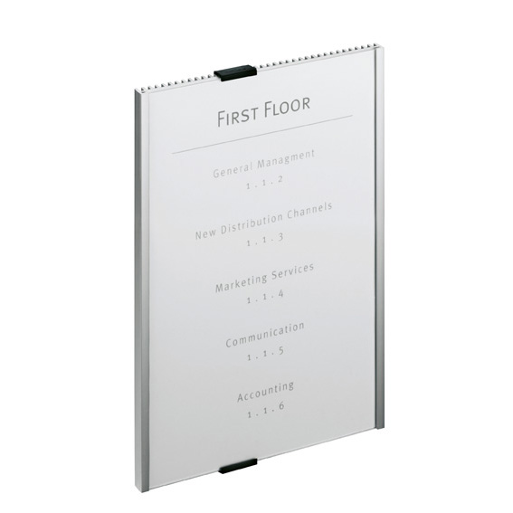 Stilren skylthållare för instick med reflexfri frontskiva i akryl.