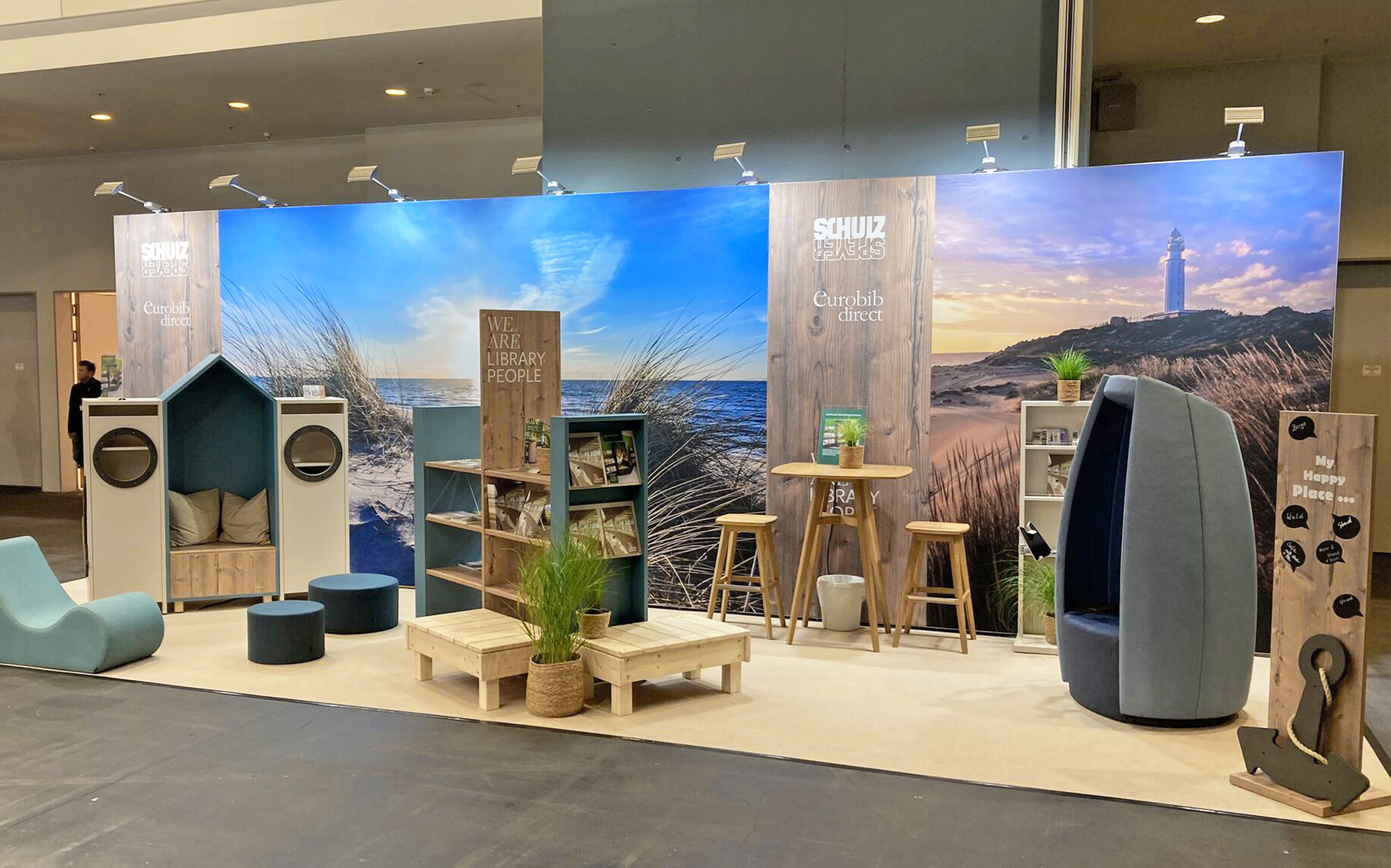 När vi fördjupade oss i den komplicerade utformningen av vår monter för BiblioCon skiftade vårt fokus till att översätta vår tematiska vision till konkreta element som fängslar sinnena och sätter fart på fantasin. Vi var också tvungna att följa den ekonomiska ramen för utställningen, liksom våra designprojekt baseras på en specifik budget. Med biofil biblioteksdesign som vägledande princip och strandens och de nordiska kusternas fridfulla skönhet som inspiration skapade vi olika zoner som tillgodosåg våra besökares olika behov och intressen.