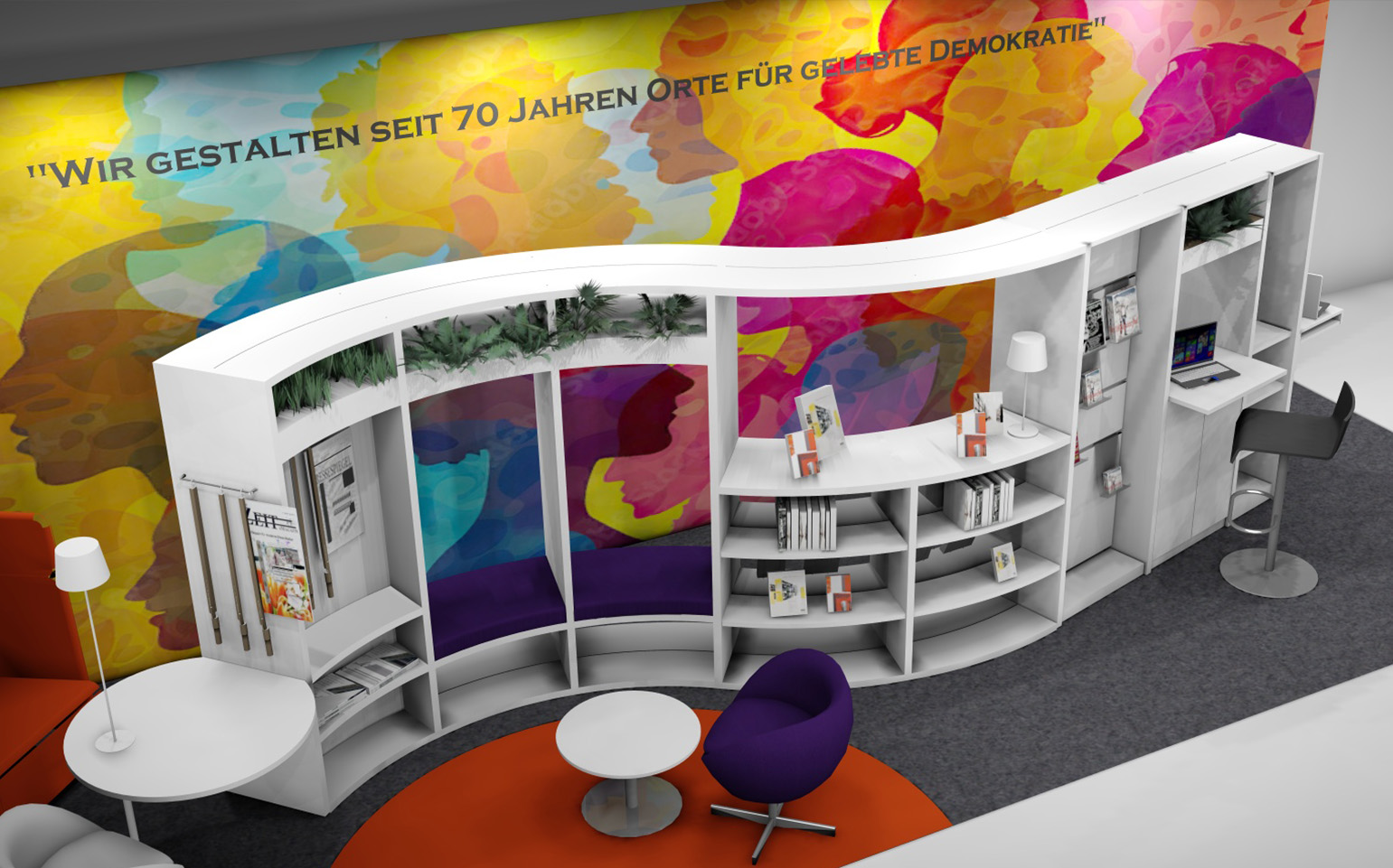 Montern hade en detaljrik och färgglad fondvägg som tydligt illustrerar samhällelig inkludering och demokratiska principer på biblioteken. För att komplettera denna fondvägg har vi valt vita och neutrala toner till våra möbler i montern, vilket skapade en slående kontrast och understryker utställningens färgstarka och demokratiska tema.