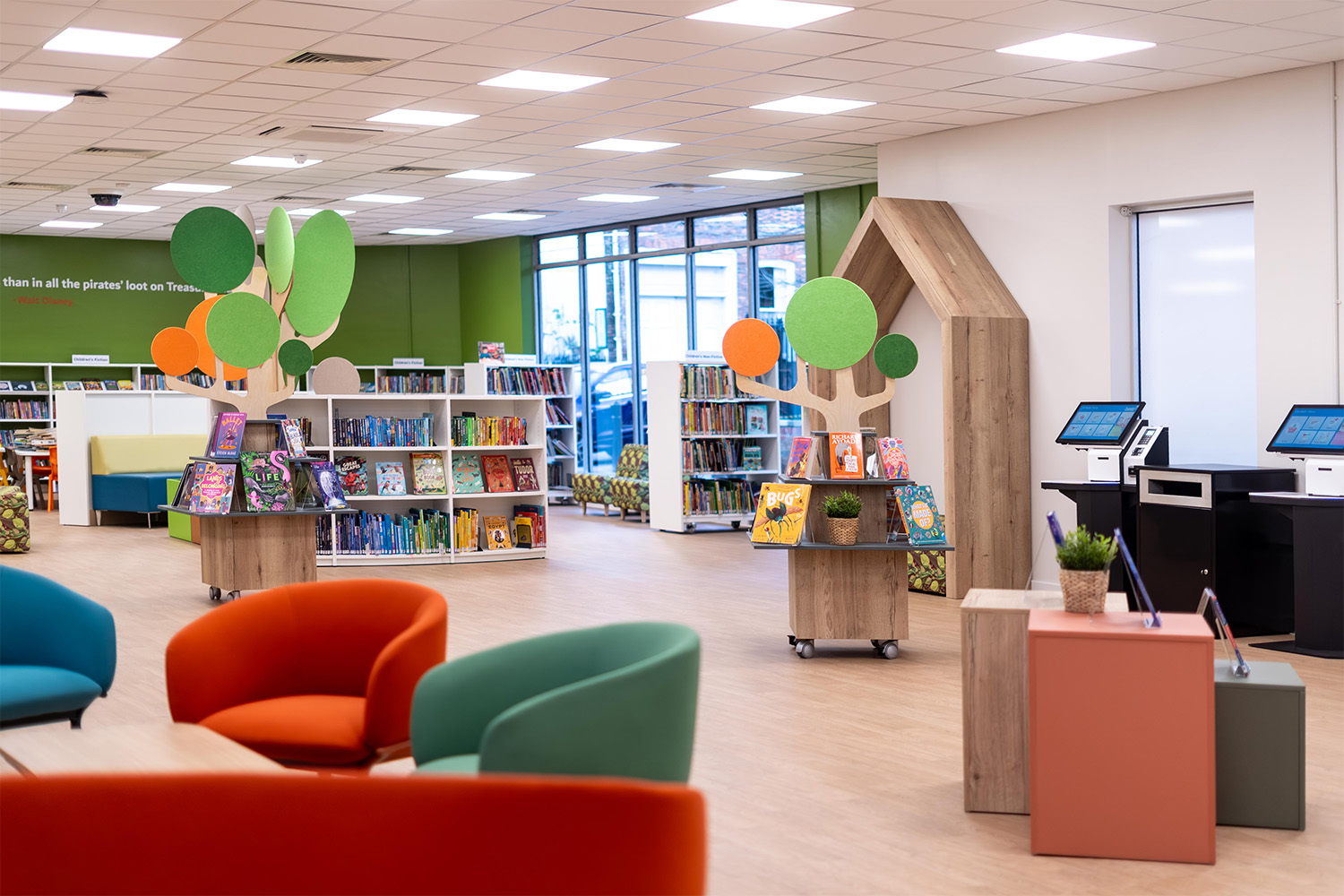 Eftersom Essex County Council prioriterar miljövänliga offentliga rum i sina renoveringar, arbetade vi nära dem för att ge de befintliga bokhyllorna nytt liv. Genom att lägga till ny beklädnad på de befintliga stommarna skapade vi en slående visuell uppgradering – med respekt för både resurser och hållbarhet.