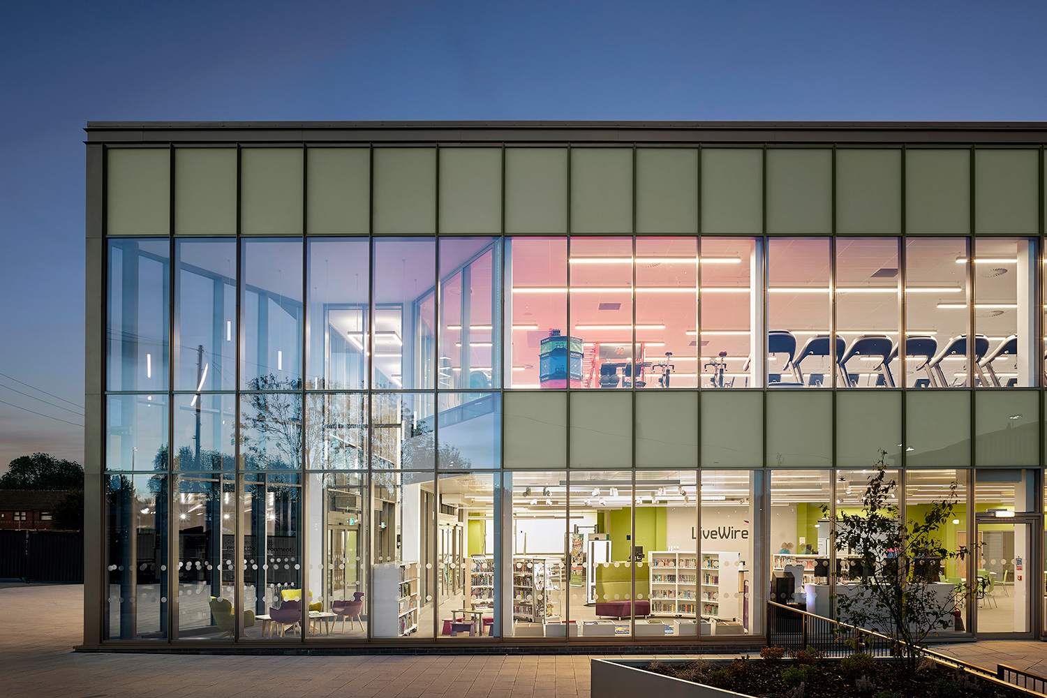 Great Sankey Neighbourhood Hub erbjuder flera faciliteter. I byggnaden ingår flera hälso-, fritids- och bibliotekstjänster för lokalsamhället. Thedesignconcept ltd. har arbetat nära alla inblandade för att skapa en design enligt arkitektens ursprungliga vision. Eftersom byggnaden är det första offentliga hälsocentrat som söker demensvänlig certifiering, undersökte vi 'best practice' för demensvänlig design i syfte att uppnå godkännande från Stirling DSDC.