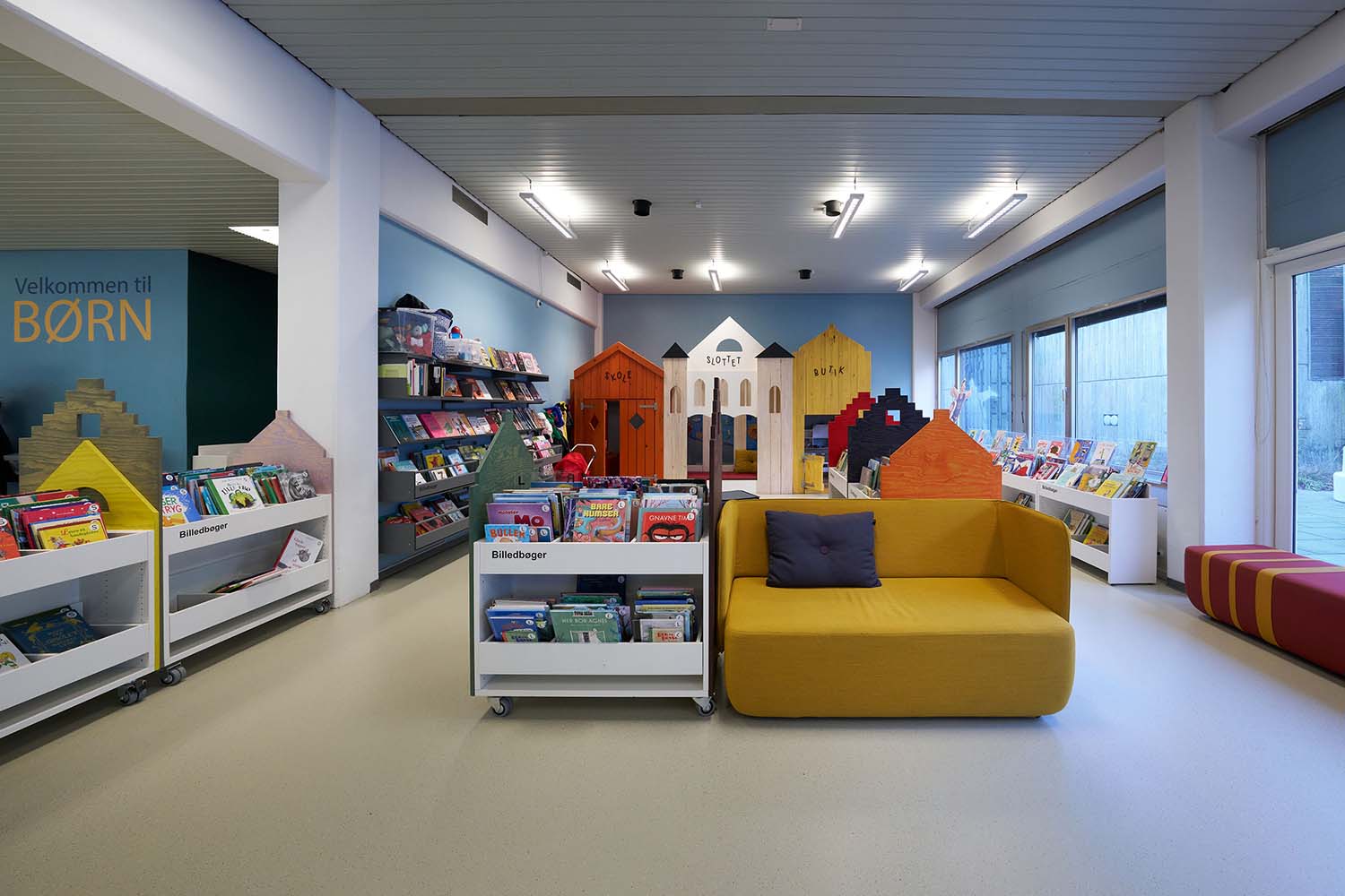 På Taulov bibliotek har man genomfört en enkel uppgradering av de befintliga röda hyllorna med nya gavlar. På barnavdelningen har man tillfogat sidopaneler till bilderbokslådorna, vilket tillsammans med de specialbyggda husen skapar en fin stämning.