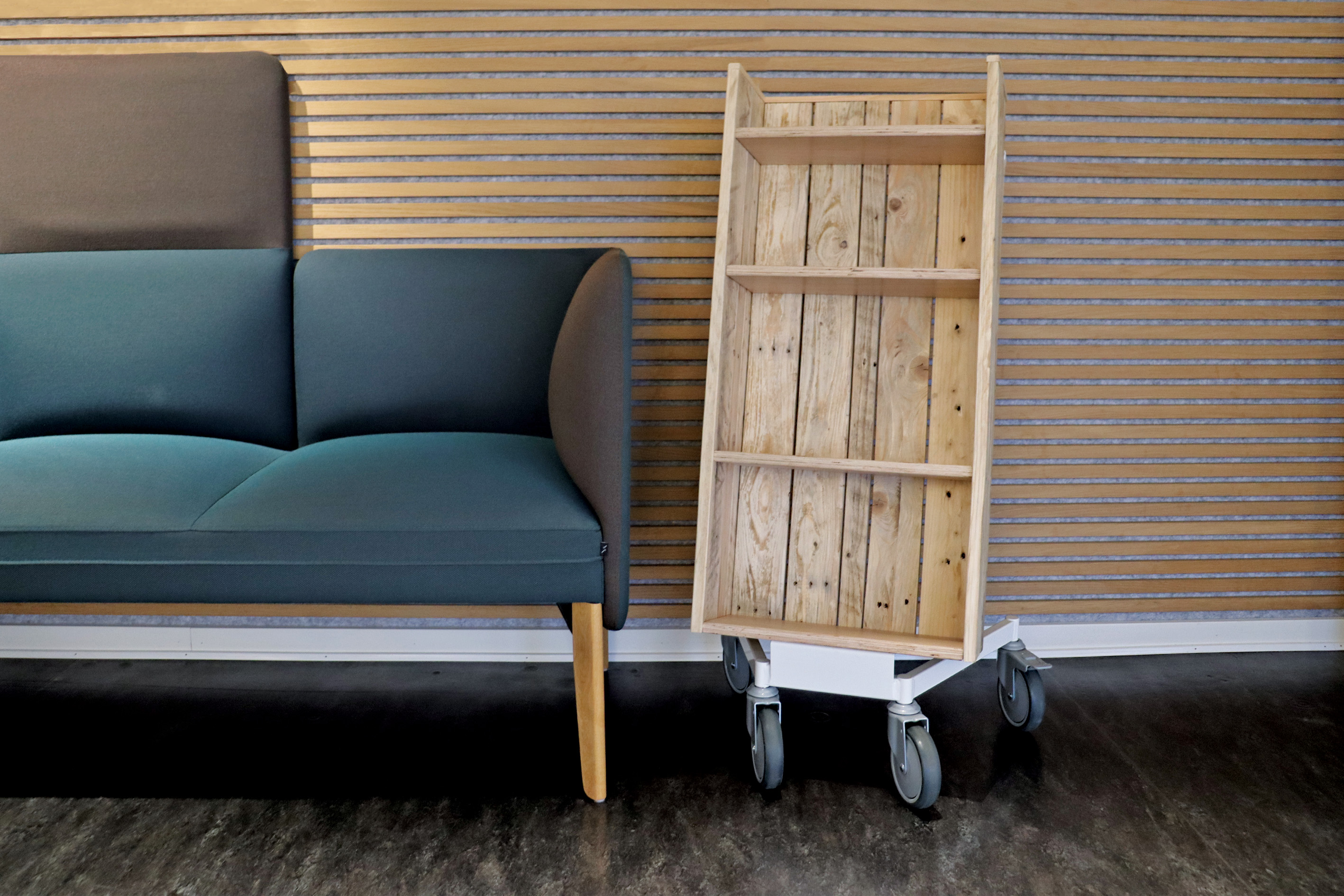 Varje träbit bär på berättelsen om sitt tidigare liv, vilket ger bokvagnen en speciell karaktär och tillför värme och en modern touch till biblioteksinredningen.
