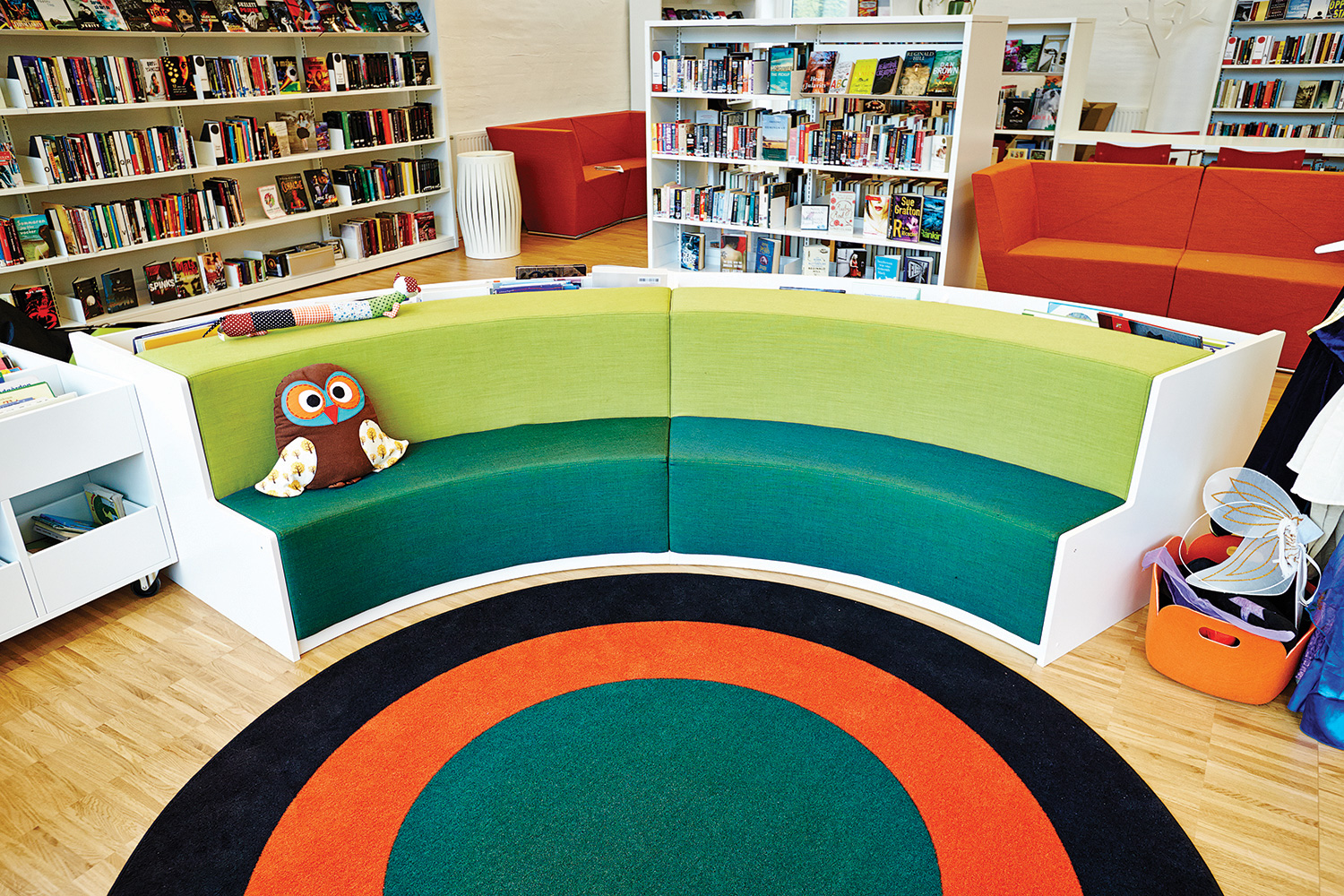 Att arrangera en sittgrupp på en matta skapar enkelt en zon utan att använda fysiska barriärer. Mattan håller samman zonen och fungerar som platshållare för möbler vilket förhindrar att de flyttas runt i biblioteket.