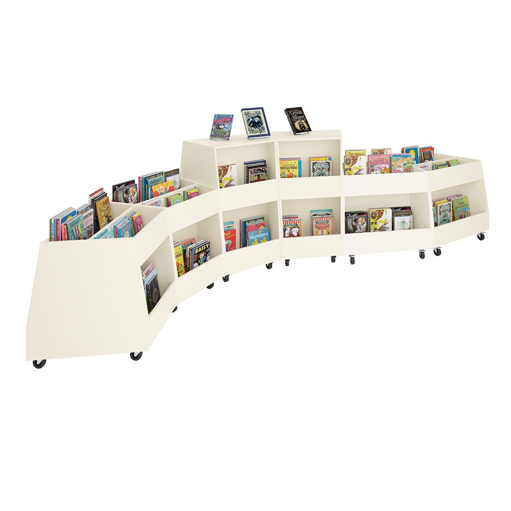Den karaktäristiska formen gör det möjligt att kombinera flera enheter i mjuka kurvor, flytande former eller tydligt avgränsade zoner. Perfekt för temaexponering, mysiga läshörnor eller som ett centralt blickfång – öppen, inbjudande och lätt att möblera om.