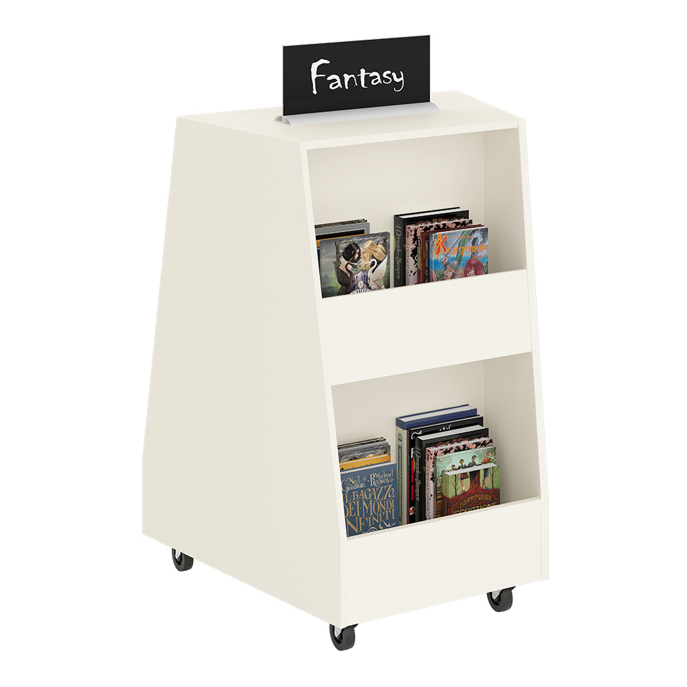 Kaja tråg är en dubbelsidig, trapetsformad bokexponering framtagen för moderna barnbibliotek. Med två höjdnivåer blir böckerna lätta att se och nå för barn i olika åldrar.