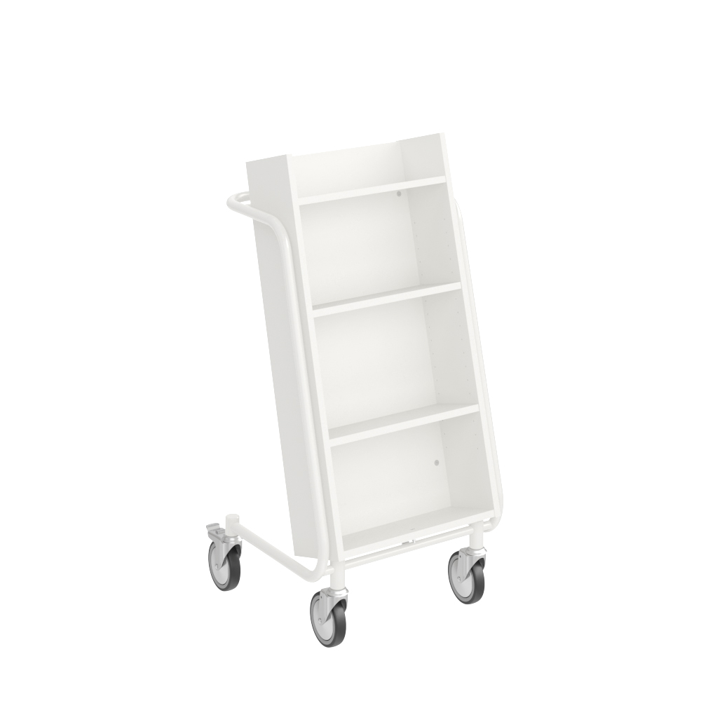 Smidig, enkelsidig vagn med 4 hyllplan. De två mellersta hyllplanen är flyttbara för att passa olika bokstorlekar.