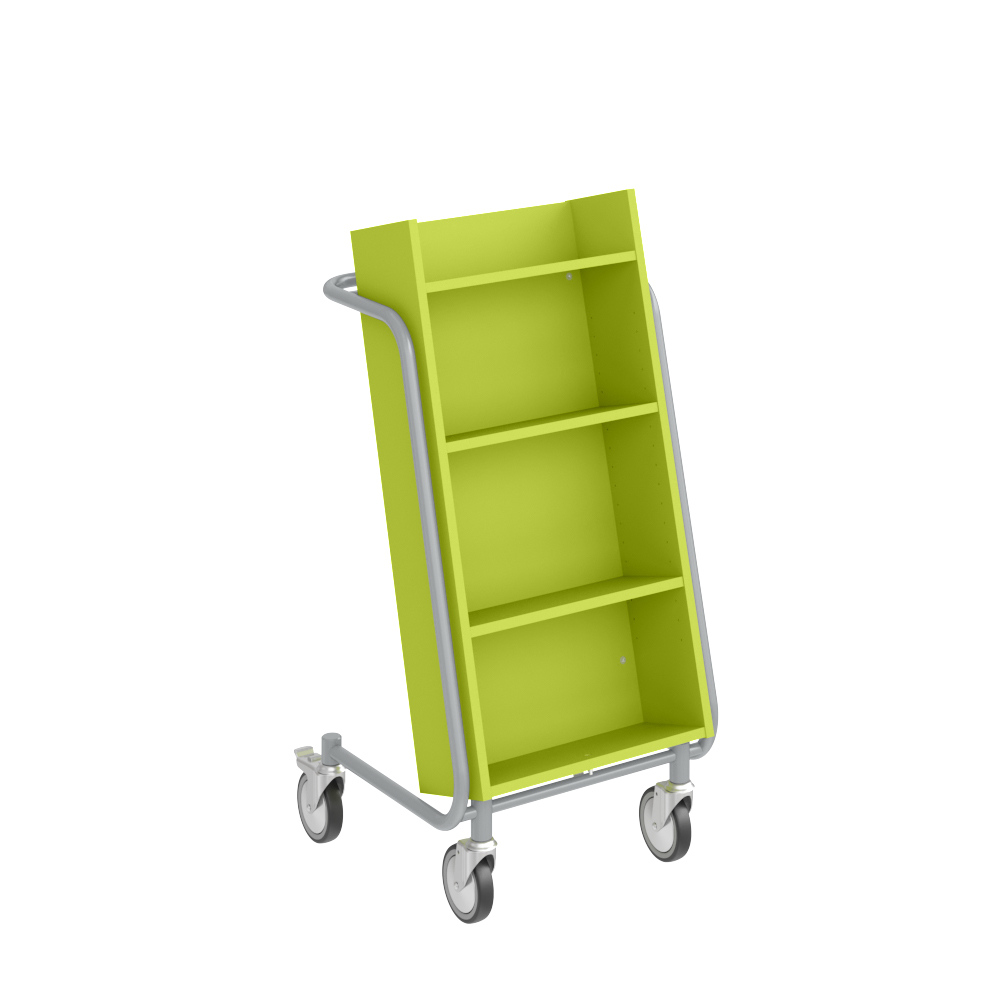 Smidig, enkelsidig vagn med 4 hyllplan. De två mellersta hyllplanen är flyttbara för att passa olika bokstorlekar.