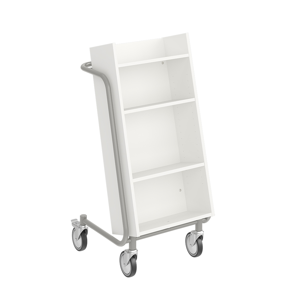 Smidig, enkelsidig vagn med 4 hyllplan. De två mellersta hyllplanen är flyttbara för att passa olika bokstorlekar.