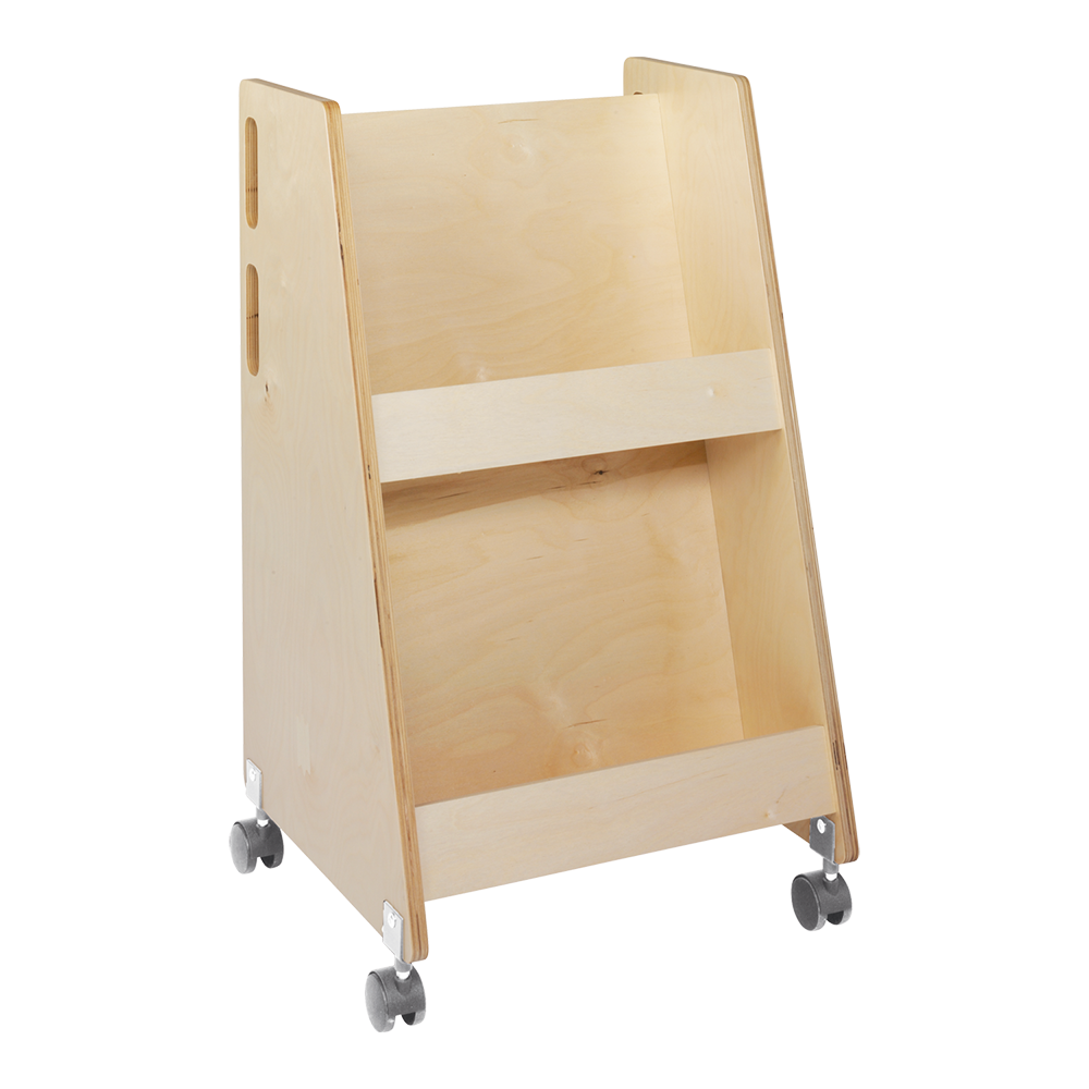 Nätt bokvagn i björkplywood med 2 fasta framkantslistade hyllplan för frontexponering av exv. bilderböcker.