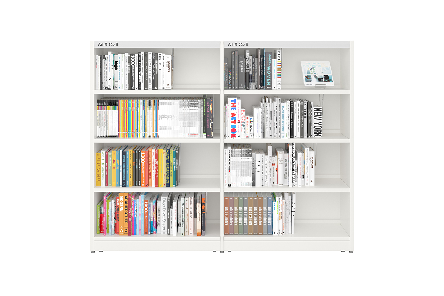 - med ett stort urval av hyllplan (metall eller trä, plana eller lutande, bakkants- eller hängande bokstöd)
