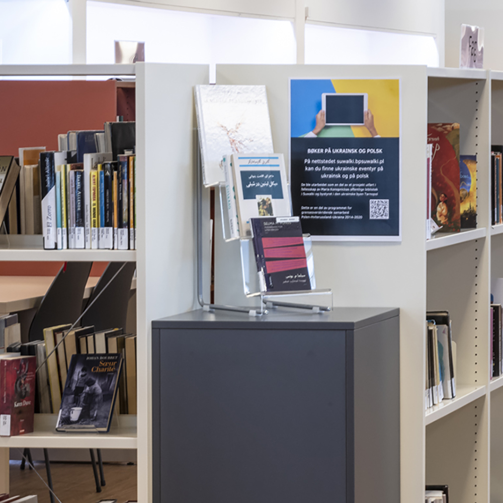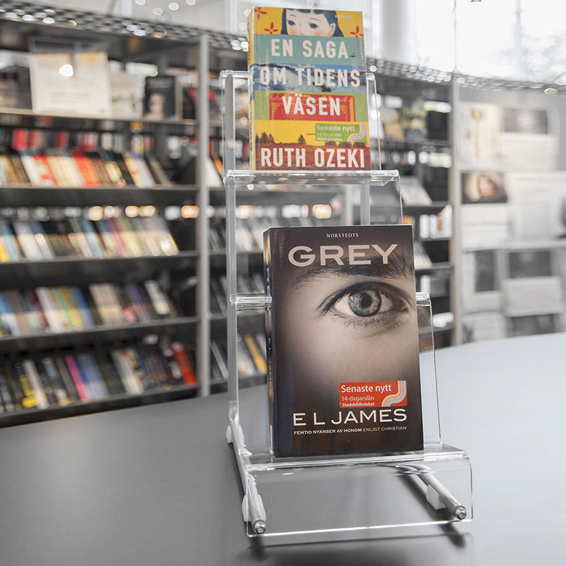 Fristående, enkelsidigt ställ för frontexponering av böcker i 3 våningar.