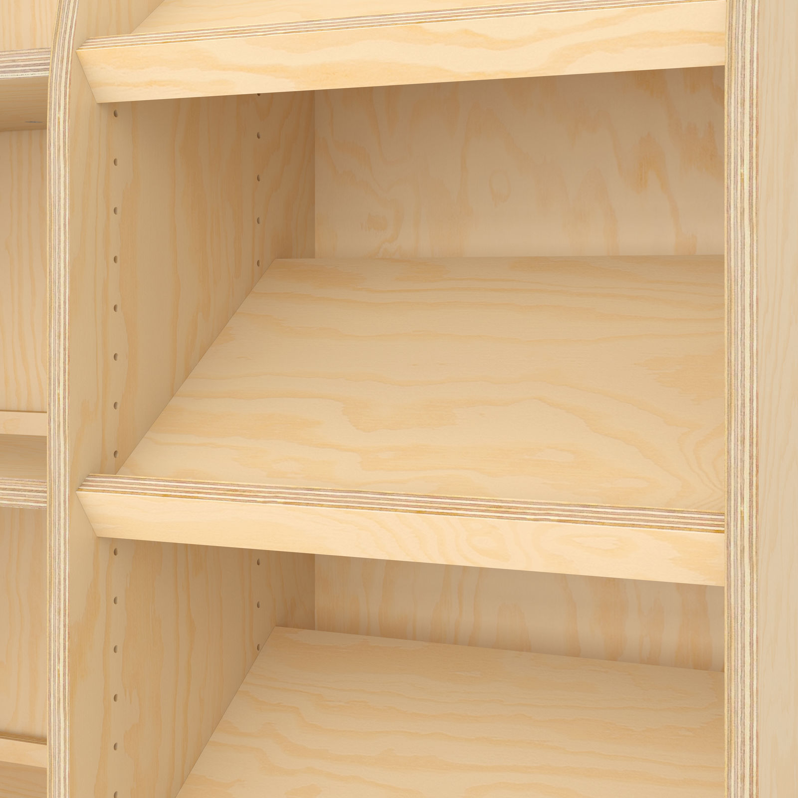 Hyllplanen är försedda med en kantlist och kan antingen placeras plant med listen bak eller som tidskriftshyllplan med listen framtill.
