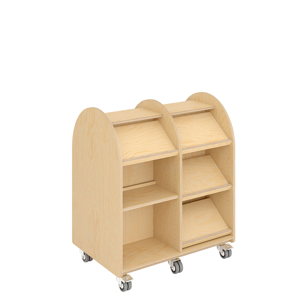 Du kan enkelt förändra ett plant hyllplan till ettvinklat tidskriftshyllplan genom att sätta fästena diagonalt i panelen. Hyllsystemet är detsamma. Enkla och flytta rundt på med dubbla hjul av hög kvalitet. Användarvänligt är nyckelordet.