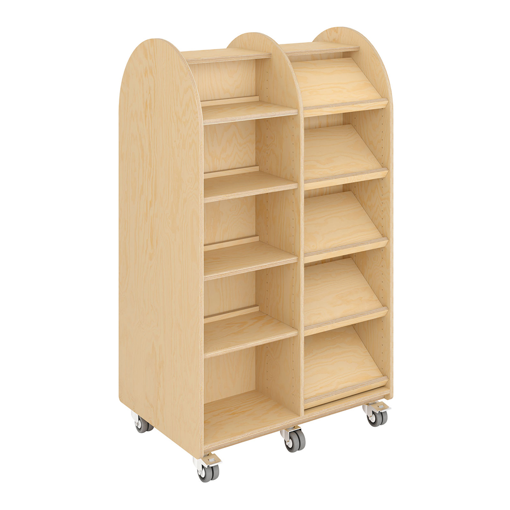 Du kan enkelt förändra ett plant hyllplan till ettvinklat tidskriftshyllplan genom att sätta fästena diagonalt i panelen. Hyllsystemet är detsamma. Enkla och flytta rundt på med dubbla hjul av hög kvalitet. Användarvänligt är nyckelordet.